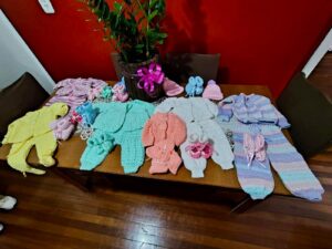 Os kits recebem peças cuidadosamente confeccionadas à mão, incluindo toucas, roupinhas e pares de meias. Cada item carrega não apenas a função de aquecer, mas também o carinho e a dedicação de quem há anos transforma linhas e agulhas em gestos de amor.