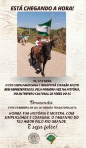 Está chegando a hora. Nos dias 16, 17 e 18 de abril, o município de Ibirapuitã viverá um momento inédito. Pela primeira vez na história, o CTG Seiva Pampeana estará representado no Entrevero Cultural de Peões do Rio Grande do Sul.