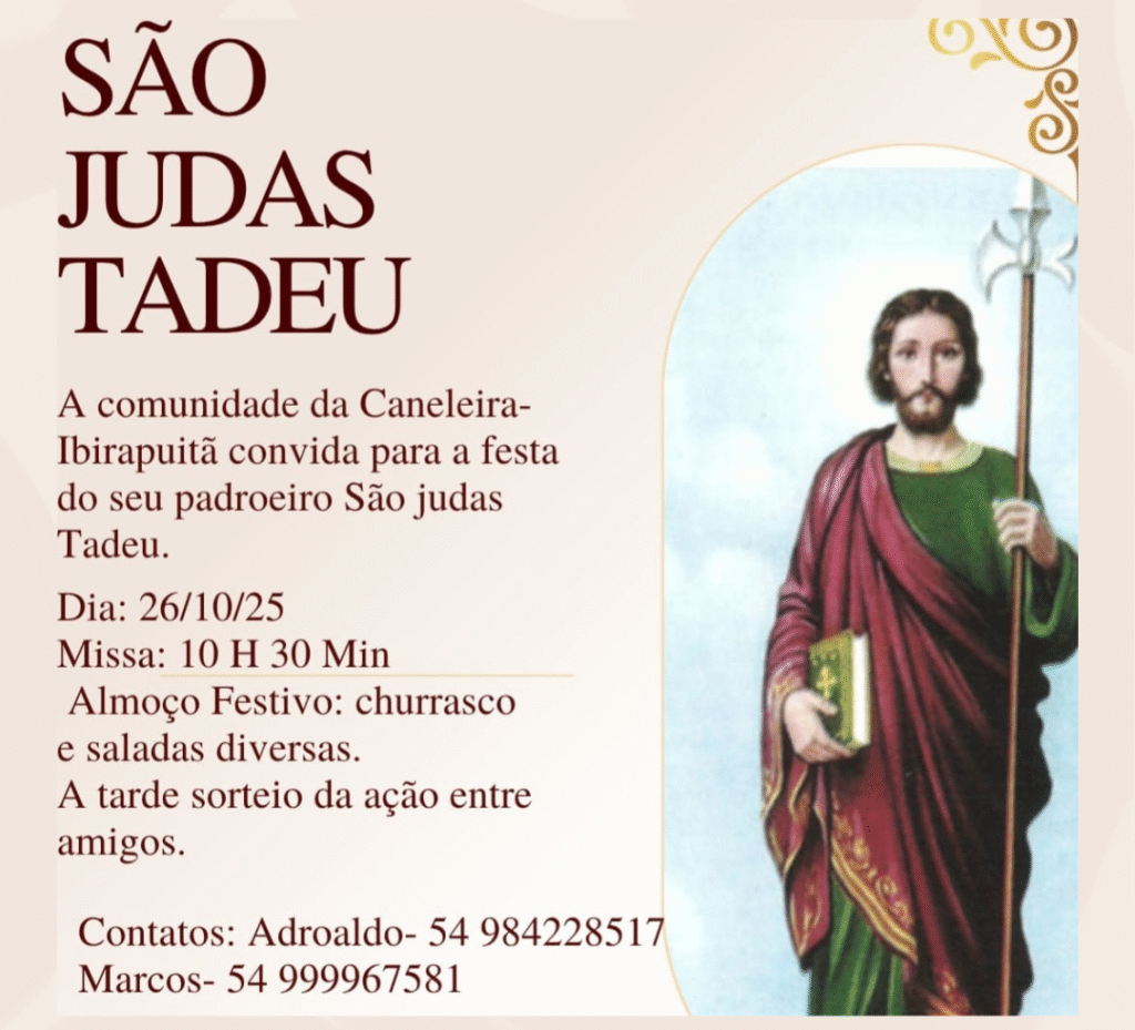 A comunidade da Caneleira, convida a todos os fiéis e amigos para a tradicional festa em honra ao seu padroeiro São Judas Tadeu, um momento de fé, convivência e gratidão.