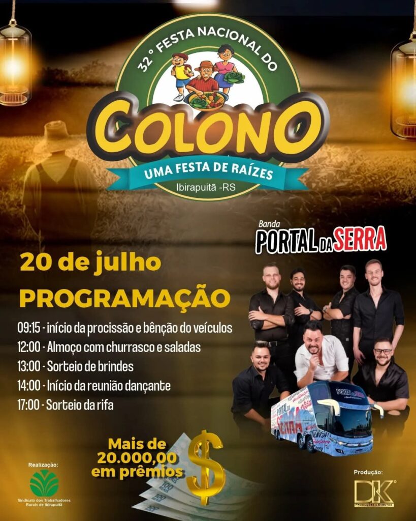 32ª Festa Nacional do Colono — Uma Festa de Raízes. No dia 20 de julho, Ibirapuitã será palco de uma das celebrações mais tradicionais da região: a 32ª Festa Nacional do Colono. Com o tema “Uma Festa de Raízes”, o evento homenageia a força, a fé e a dedicação dos homens e mulheres do campo — os verdadeiros pilares da nossa comunidade. O encontro acontece no CTG Seiva Pampeana, e promete reunir famílias, agricultores e visitantes em um dia repleto de fé, cultura, música e diversão.