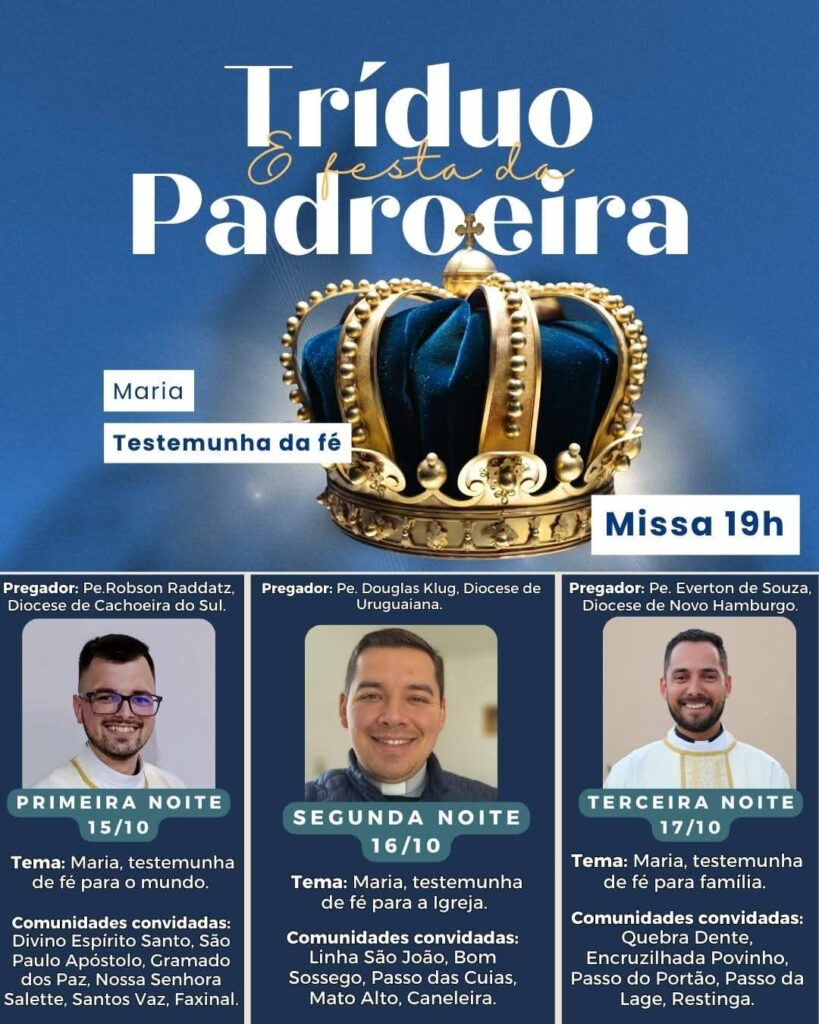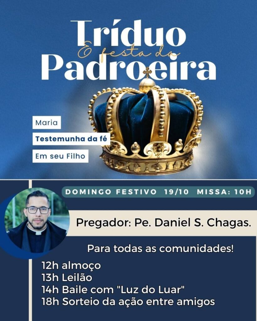 Com grande alegria, convidamos toda a comunidade para participar do Tríduo e Festa da Padroeira, um tempo especial de fé, devoção e comunhão, com o tema:“Maria, Testemunha da Fé em seu Filho”